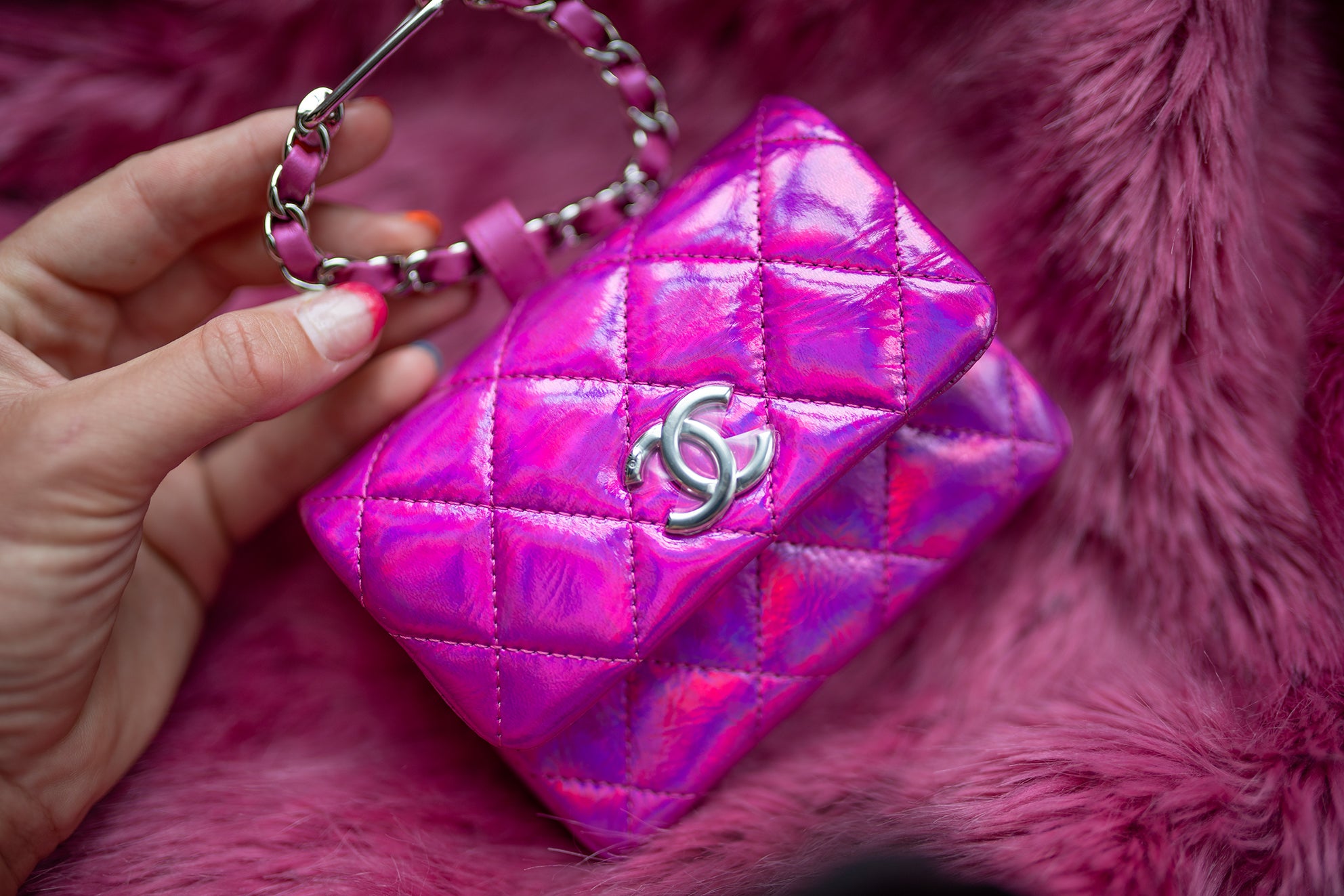 24C Iridescent Fuchsia Pink Patent Leather Quilted Silver Hardware