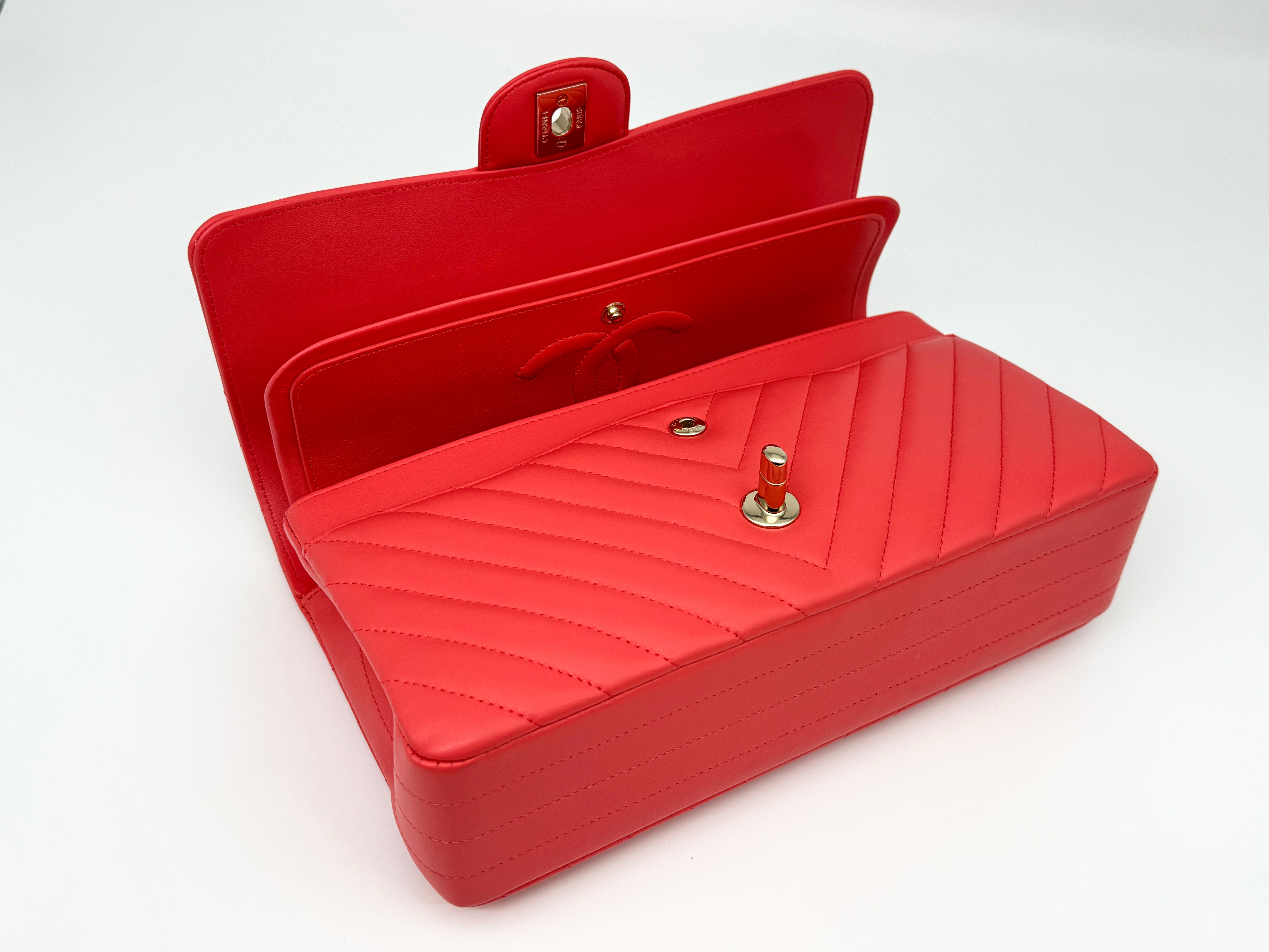 This Classic Flap Handbag in the Medium size is in a stunning Coral colour which is very unique, giving a lovely pop of colour with orange, red and pink undertones. Chanel rarely reproduces a colour which makes every seasonal colour they produce even more special.